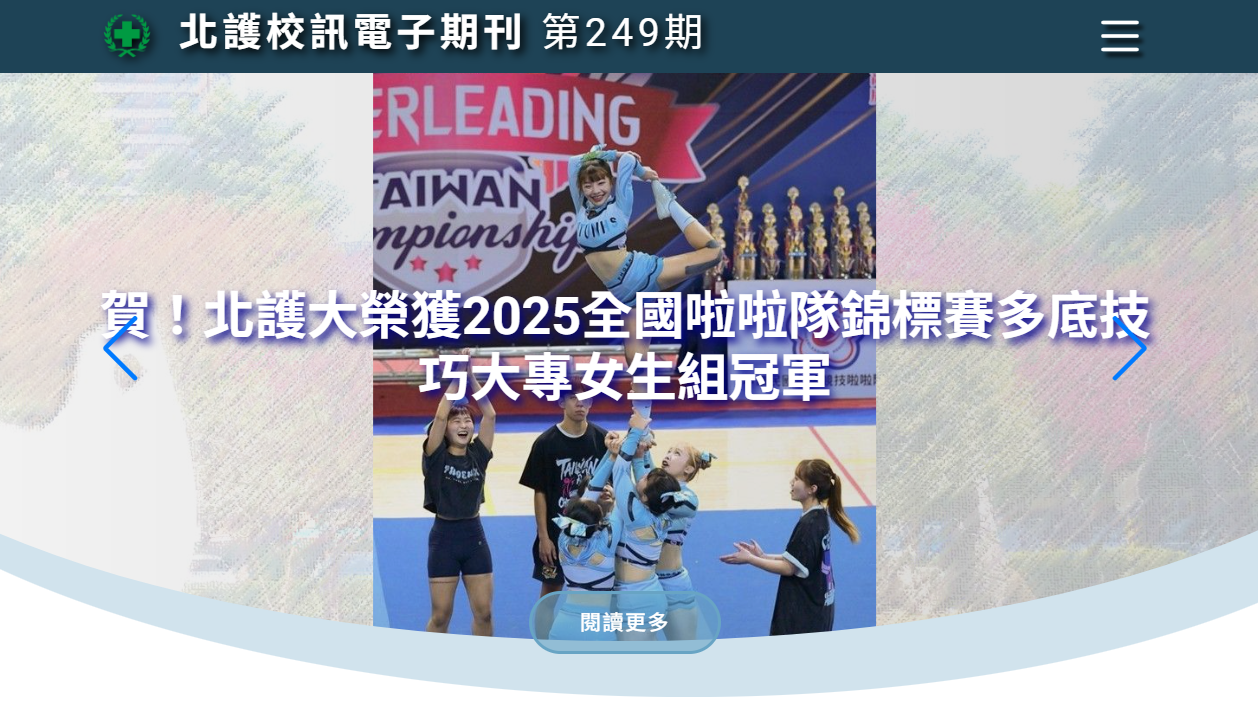 北護校訊電子期刊第249期出刊!本期報導競賽獲獎、原住民文化、大師講座、大學社會責任、全人性教育、影展獲獎等精彩文章。