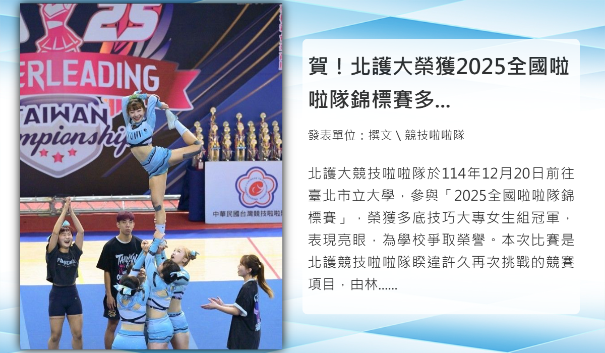 賀!北護大榮獲2025全國啦啦隊錦標賽多底技巧大專女生組冠軍